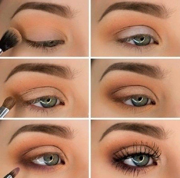 На всю область верхнего века, вплоть до самых бровей, необходимо нанести бежевые тени. Подвижное веко покрываем зеленым тоном теней. Для более легкого взгляда не следует наносить тени на внутреннем уголке глаза. Вместо подводки для прорисовки линии ресниц верхнего века используйте темно-коричневые тени. Закрепляем макияж черной либо коричневой тушью