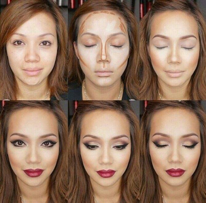 На фото примеры правильного макияжа и разные способы контурирования: