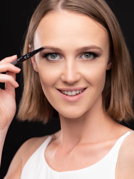 После того, как вы нанесете тени, подкрасьте полоску кожи под бровью светлым карандашом и растушуйте, таким образом вы визуально сделаете брови выше и откроете взгляд. После припудрите веки, так тени будут держаться дольше.