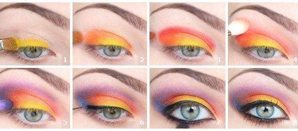 Выбирая цвет теней, исходите из цвета вашего наряда, при этом не старайтесь выбрать спокойные, пастельные тона. Пусть это будут серебристые, черные, ярко-синие или пурпурные цвета. Если ваш наряд можно назвать «веселеньким», то смело используйте желтые, салатовые или рыжие тени. Для основы используйте либо специальное средство, либо светло-бежевые тени. Такая подложка поможет цветам быть насыщеннее.