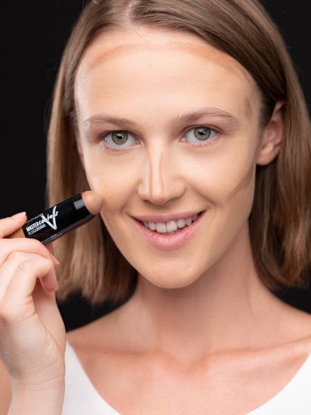 Чтобы сделать лицо более точеным, используйте кремовый корректор коричневого оттенка. Затемните им область под скулой, крылья носа и нижнюю границу челюсти.