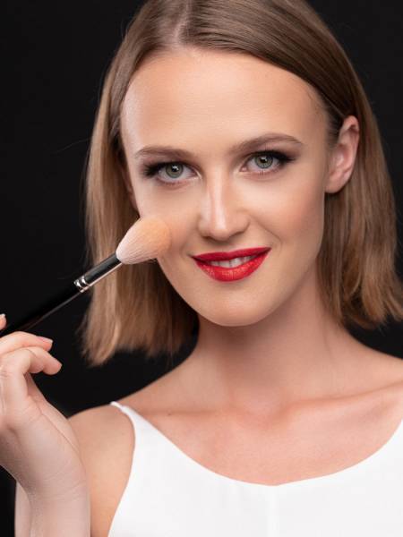 Если вы сделали яркими глаза и губы, но при этом использовали только тон и скульптор, лицо может выглядеть слишком блеклым. Поэтому завершите макияж с помощью румян, хайлайтера и бронзера. Румяна растушуйте от яблочек щек к скулам, бронзером пройдитесь по выступающим частям лица (верх и боковые стороны лба, скулы, крылья носа, подбородок, внешний контур нижней челюсти), хайлайтер нанесите на верхние части скул, спинку носа, ямочку над подбородком. Готово!