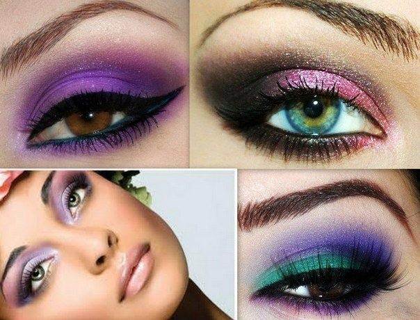 Выбранные базовые тона макияжа должны контрастировать с типом. Для голубоглазых девушек отлично подходят зеленые, розовые, солнечные желтые тени. Для брюнеток напротив, сиреневые, холодные синие цвета в ярком макияже. Зеленые тени подчеркнут мистические изумрудные или агатовые глаза.