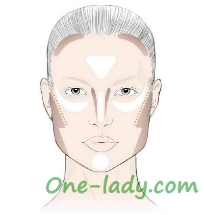 Смягчить некоторую угловатость лица прямоугольного типа можно при помощи макияжа. Основным приемом коррекции в этом случае становится высветление центральной части лица и затемнение боковых поверхностей. Зоны высветления и затемнения для коррекции демонстрирует следующая схема макияжа: