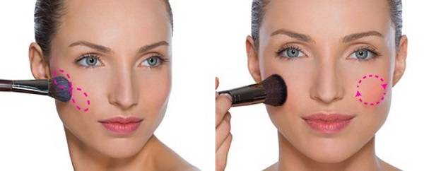 В зависимости от формы лица меняется и принцип нанесения румян. При идеальном овале они наносятся только на скулы с изначально круглой формой и растушевкой к виску. Удлиненный овал можно зрительно уменьшить, если нанести румяна на кончик подбородка треугольником, который направлен вершиной в середину нижней губы. А также на верхнюю часть лба мягким овалом. Скулы при этом растушевываются не только к виску, но и к стыку челюсти.