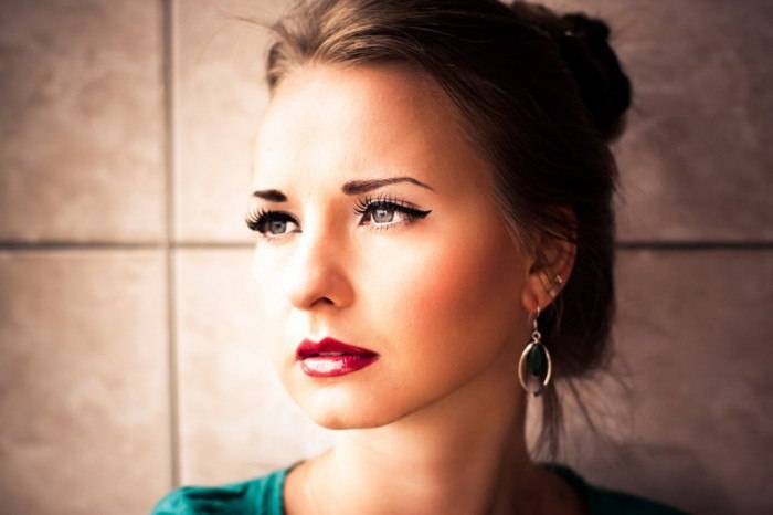 - Теперь наведите тоненькие стрелки, немного приподняв их вверх. Поверх стрелок можете наложить светлые тени. Далее красим ресницы, накладываем румяна и красим губы матовой помадой. Ее цвет может быть персиковым, розовым, бордовым.