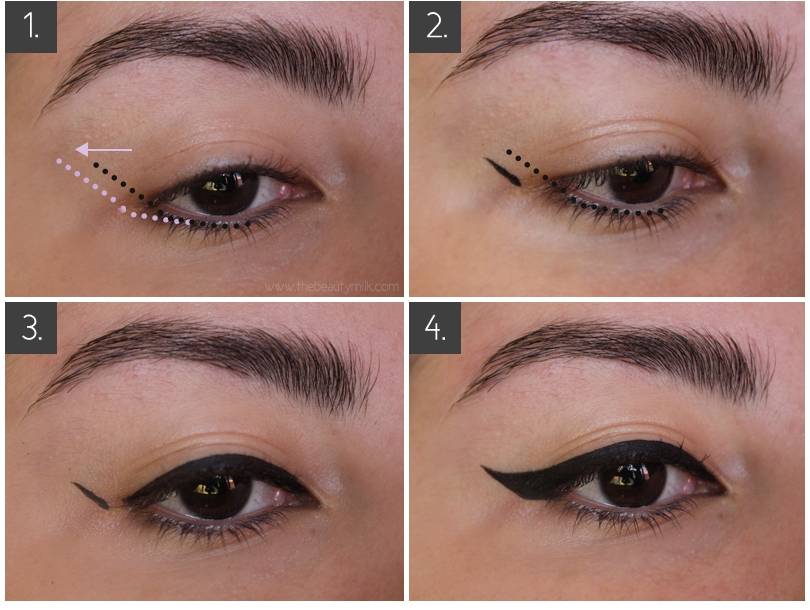 - Расширяющаяся к внешнему уголку линия подводки позволит сделать глаз менее узким;