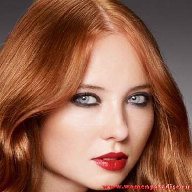 - Рыжие волосы, по оттенку тяготеющие к темным, подчеркиваются выделением глаз серым, оливковым, пурпурным и кремовым цветами. При необходимости можно компоновать перечисленные оттенки в разных вариантах.