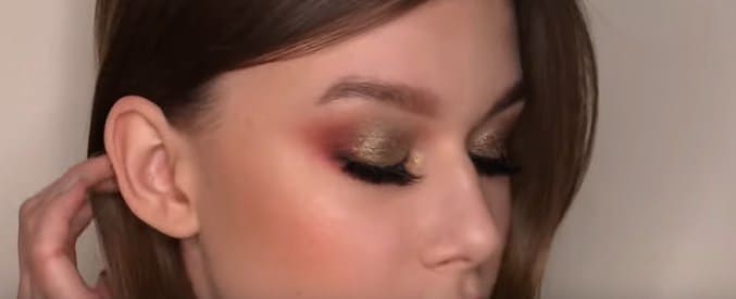 - Медно-коричневым оттенком теней оформляем нижнее веко, более интенсивно прорисовывая его лишь у внешнего уголка глаза;