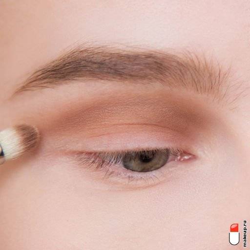 - Сначала покрываем всю поверхность века нежными тенями серовато-бежевого тона;