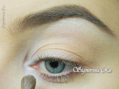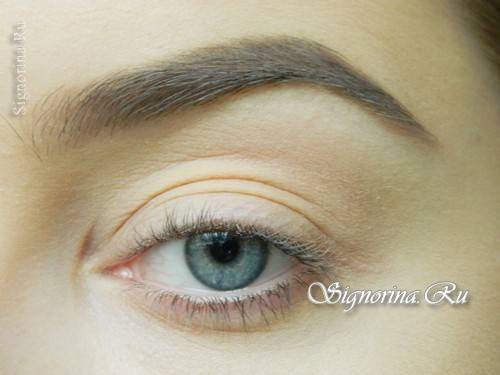 - Светлые базовые тени наносятся на всё веко, начиная от самой брови и заканчивая его подвижной частью.