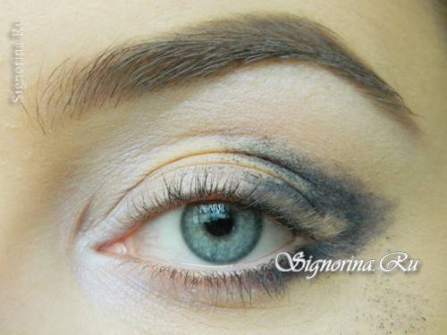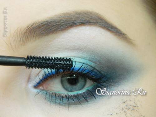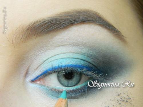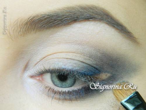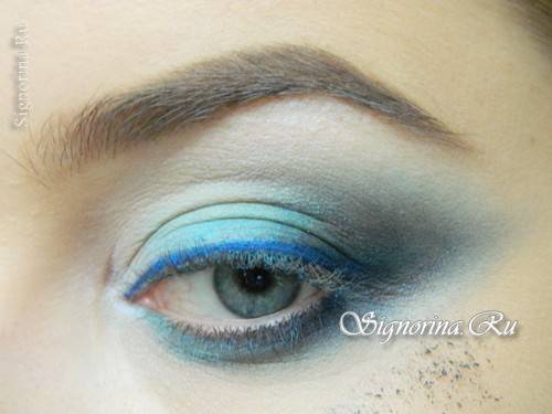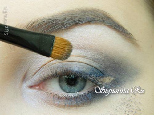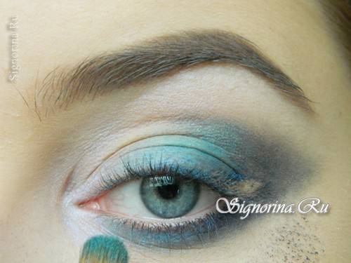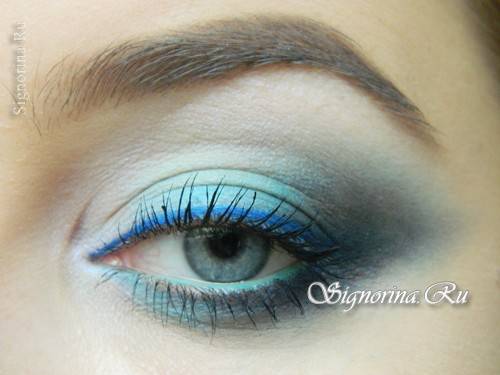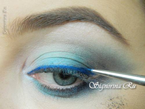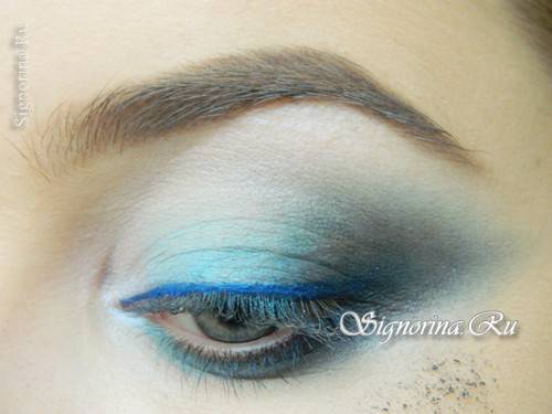 На середину нижнего и верхнего века наносим голубые тени, хорошо смешивая их с уже растушёванным тёмно-синим цветом. Цвет этот должен быть интенсивным и плавно растворяться в перламутровом оттенке в уголке глаза.
