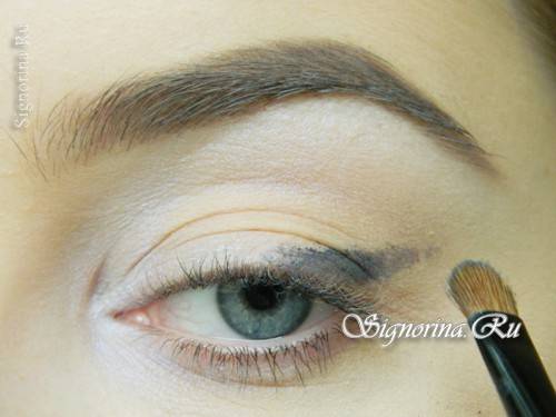 Теперь нанесём на тушёвку по неподвижному веку немного голубых теней. Лучше всего для этой задачи подойдёт мягкая пушистая кисть. Наберите немного теней и лёгкими движениями повторите уже имеющуюся форму тушёвки.