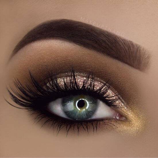 Тени для повседневного макияжа — терракотовые или золотистые, для создания вечернего образа хороши контрастные комбинации, например, сияющий кристальный плавно затемняется до черноты к внешнему уголку верхнего века, верхняя часть подчёркивается полосой цвета кофе с молоком. Немного хайлайтера под бровью придаст взгляду открытость, сами брови максимально приближёны к естественным