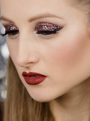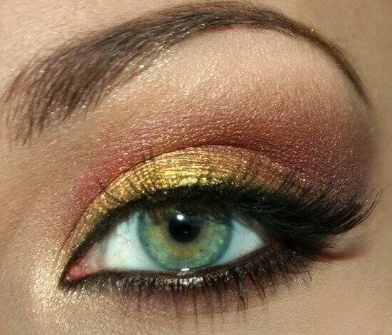 - Другим вариантом вечернего мейкапа следует указать использование теней с металлическим блеском, а также средств медных и золотых цветов.