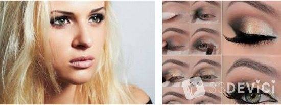 - Красивый макияж для блондинок допускает наличие коричневых и золотистых оттенков. Накрасить веки блондинок можно и темными бронзовыми тенями.