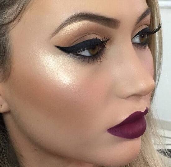 - Чтобы сделать взгляд казался выразительным, попробуйте оттенить веко бордовым оттенком. Сравнительно с банальным бежем это смотрится намного праздничнее. Нужно взять на кисточку немного бордового цвета и усердно растушевать его по складке века.