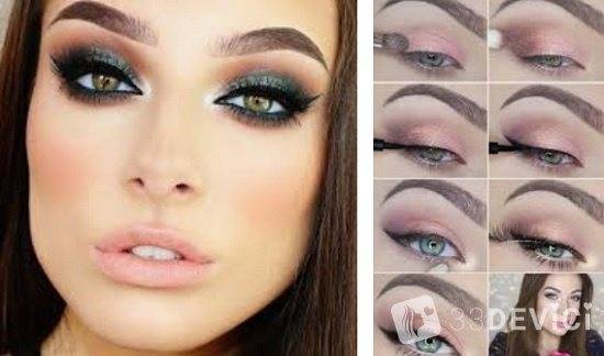 - Если использовать блестящие тени, получится вечерний макияж для брюнетки с зелеными глазами.