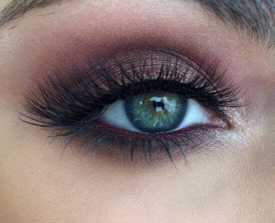 Мягкие шоколадные оттенки, тени с пурпурными и желтоватыми вкраплениями помогут превратить светло-серые очи в зеленые.