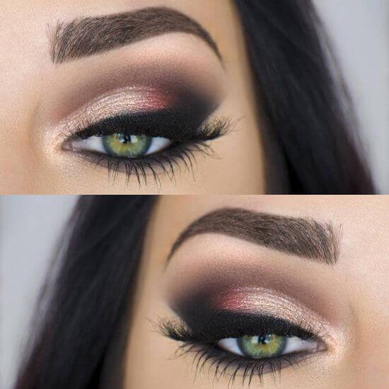 - Брюнеткам, как никому другому, подойдет радикально черная подводка и макияж смоки айс для зеленых глаз. Этот мэйкап выполняется поэтапно — сначала веки нужно накрасить светлыми оттенками бронзового или золотого, а затем затемнить область вдоль роста ресниц более темным.