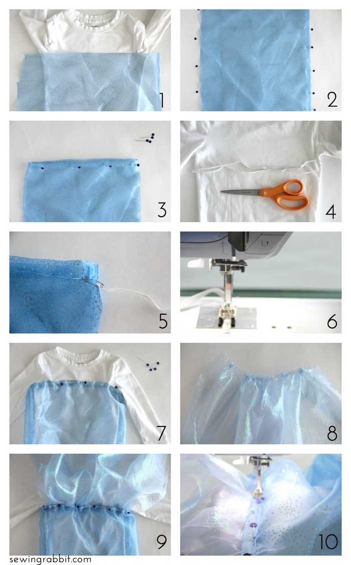 1 этап. Основой может послужить тонкая белая футболка с длинным рукавом или рукавом 3/4. А чтобы создать видимость корсета, потребуется голубая ткань, из которой вы выкроите нужную форму (не забудьте, о вырезе в форме сердца) и аккуратно приметаете или пристрочите к футболке. Сделать платье максимально эффектным поможет выбор блестящей ткани (атлас, шелк). Переливающийся голубой корсет вы украсите белыми или такими голубыми пайетками.