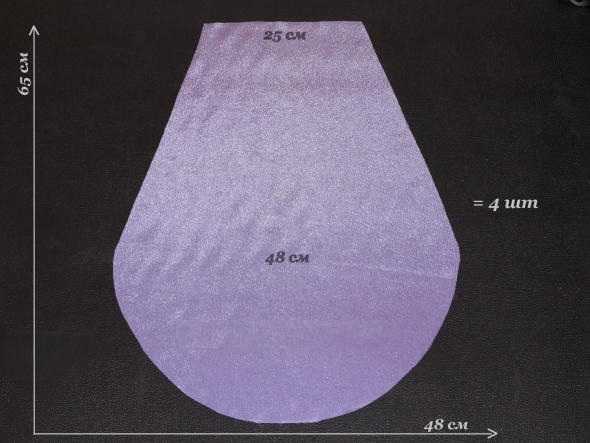 Для того, чтобы пошить нижнюю юбку платья вам потребуется атласная ткань белого цвета, а именно два куска размерами 70 на 115 сантиметров и широкая фиолетовая ленточка.