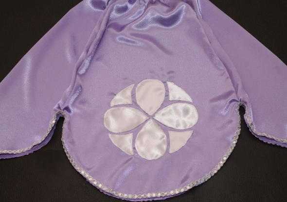 Шить платье принцессы Софии необходимо из атласной ткани. Но, для того, чтобы вашему ребенку было в нем комфортно, необходимо пришить подкладку из 100% хлопка, которую можно вырезать по той же выкройке.