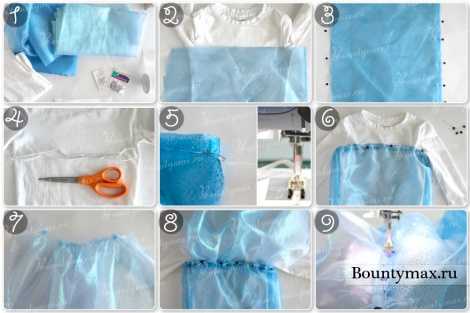 Так как я пообещала упрощенные варианты, предлагаю откинуть мороку с рукавами в сторону. Возьмите обычную белую кофточку вашей девочки, пришейте поверх нее из прозрачной ткани «корсет». Сшейте юбку и соедините ее с кофтой. Поверх можно украшать бусинками, стразами или пайетками.