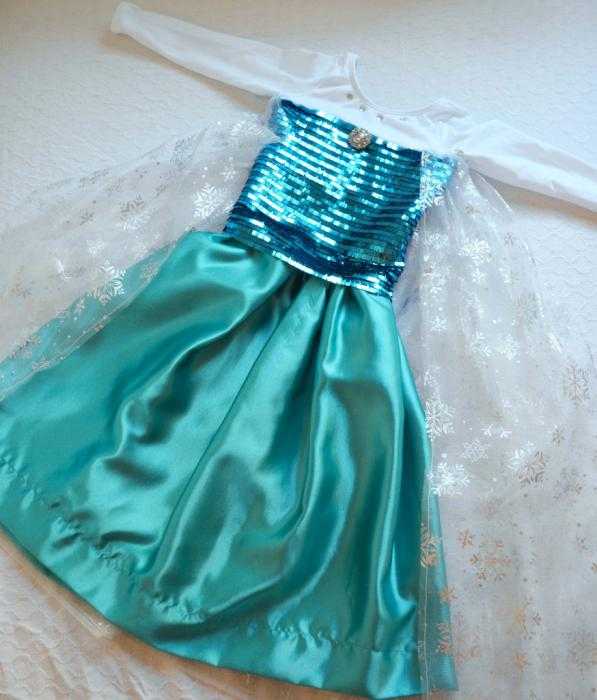 И рассмотрим еще один костюм Эльзы («Холодное серце»). Фото выглядит очень эффектно. Но если присмотреться, вы поймете, что этот наряд сделан по тому же принципу, что и предыдущий. Если вам удастся подобрать такую красивую ткань с пайетками для лифа и со снежинками для накидки, результат работы будет впечатляющим.