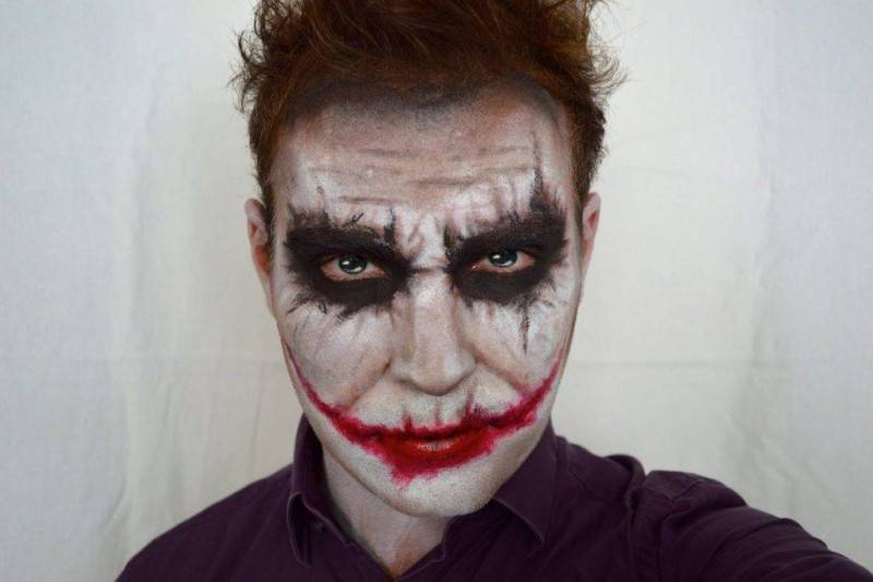 - Джокер. В этом образе также доминируют готические мотивы и краски – чёрные, красные и белые. Особенность джокера – бледное с гематомами лицо и красные губы без четких очертаний. Порядок действий: