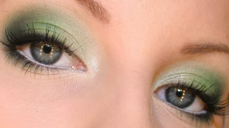 • Темно зелеными блестящими тенями выделяем под нижними ресницами и растушёвываем их на уголок глаза.