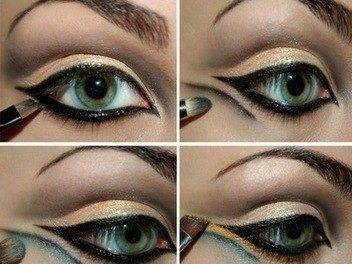 Первое, что нужно сделать- это подчеркнуть брови. Для этого вам понадобятся тени или карандаш. Оттенок теней или карандаша должен гармонично сочетаться с природным цветов бровей. Макияж глаз египетской царицы не может обойтись без использования мерцающих золотисто- желтых или же бежевых теней. Они нужны для того, чтобы придать глазам эффект сияния.
