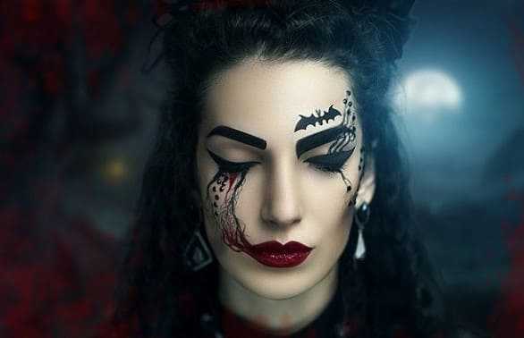 Еще один простой образ, с которым не придется долго возиться, это вампир. Стоит лишь растушевать коричневые или темно-серые тени вокруг глаз и нарисовать стекающую кровь, с помощью помады или красителя. Чтобы сделать лицо бледным, можно загримировать с помощью белой краски или пудры на пары тонов светлее вашей кожи.