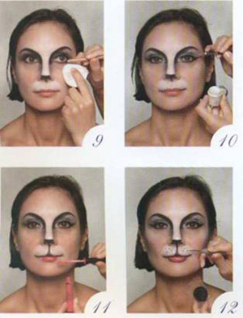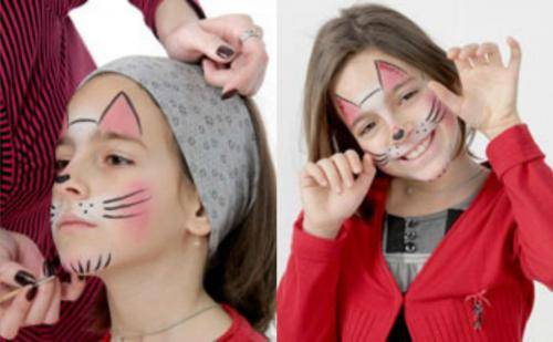 А теперь конкретно о том, кошки. Подготавливаем лицо: оно должно быть хорошо очищено. Нанесите любой увлажняющий крем, очень лёгкий, и дайте ему впитаться. Затем очередь базовой основы под грим. Дефекты кожи, прыщики маскируются консильером. Теперь черед тонирующих средств. Их цвет должен быть близок к естественному: лёгкий загар, старая слоновая кость, молочный шоколад. Румяна лучше не накладывать. Или же использовать 2 варианта: сделать розоватость щёк незаметной или, наоборот, декоративно-яркой. Последний способ накладывания больше подходит для маленьких детишек или ребят среднего школьного возраста.