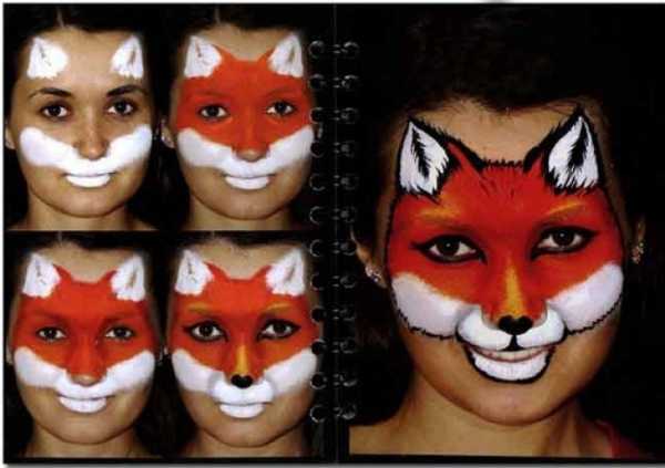 Вот еще одна пошаговая фото – инструкция по аквагриму с лисы. Здесь начинают с нанесения белой краской «ушек» и «мордочки», заполняют оранжевым цветом «голову» и далее уже черным обозначают детали.