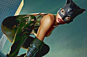 2. Героиня Холли Берри. Образ женщины-кошки из одноименного фильма отличается парой деталей: вместо комбинезона она носит черные облегающие брюки (их вам могут заменить леггинсы), черный бюстгальтер из латекса на широких бретельках и длинные перчатки. Вокруг талии нужно обвязать два ремня черного цвета, а на голову надеть черную полумаску, которую можно сшить из кожи или черной глянцевой ткани. Завершат этот образ длинные ботинки на каблуках и кнут.