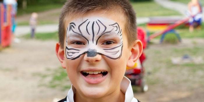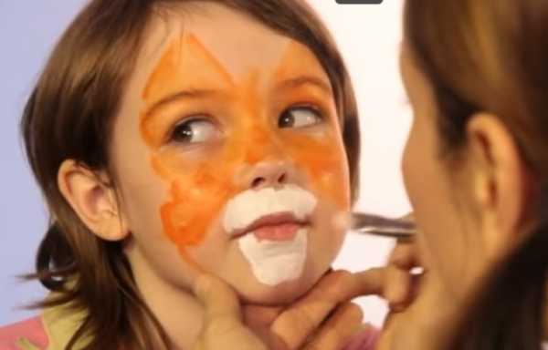 - Спонжиком между бровей у ребенка наносят белую краску. Такая же должна покрывать носогубной треугольник.