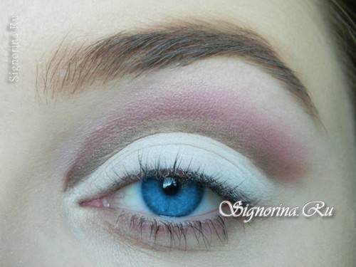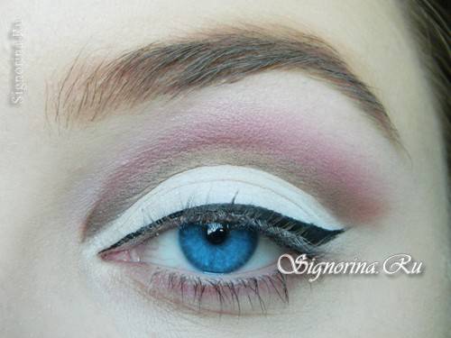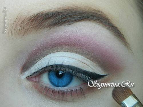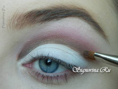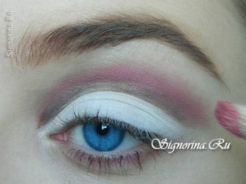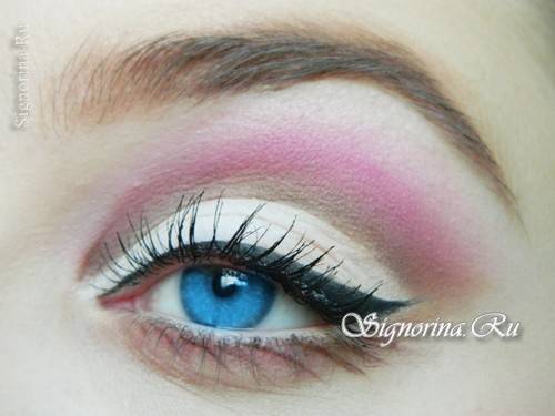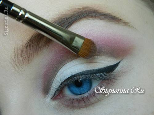 5) Верхнюю границу покрываем ярко-розовыми тенями. В этом случае удобно будет наносить тени пушистой мягкой кистью, которая предназначена для такого вида тушёвки. Если вам нужен такой макияж для фотосессии, то цвет теней должен быть ярким и насыщенным, так как камера съедает большую часть.