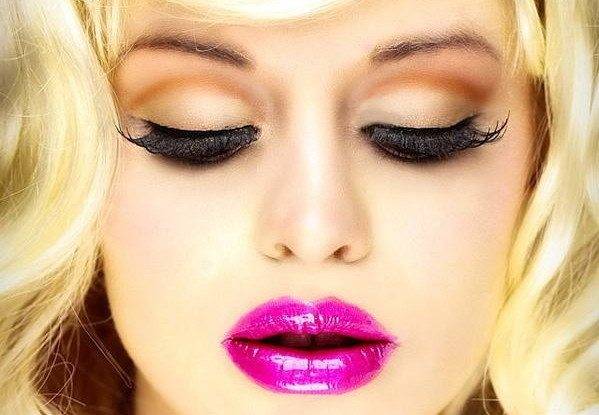 нужно подобрать цвет помады, который подходит к остальной гамме, но лучший выбор – ярко-розовый. Карандашом нарисуйте форму. Можно немного зайти за естественный край, а потом кисточкой тщательно прокрасить губы. Добавьте прозрачный блеск, чтобы губы казались более пухлыми. Лучше не использовать красный цвет помады, он отлично смотрится в других образах, но только не в этом.