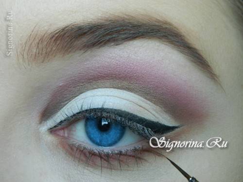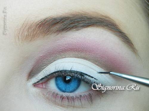 7) Верхний ресничный ряд выделим при помощи чёрной подводки. Ведём тоненькую стрелочку и слегка расширяем её со зрачка. Хвостик делаем недлинный и аккуратный. Теперь явно виден контраст чёрной стрелки на белом цвете и прокрашенной верхней детали. Эти нюансы увеличивают глаз и делают его более выразительным.