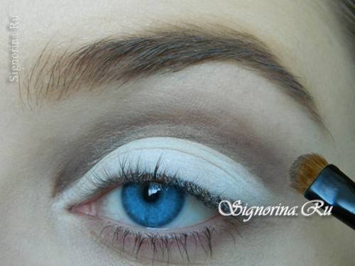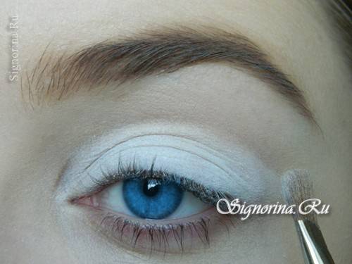 2) Для подвижного века подберите белый цвет теней. Если у вас смуглая кожа, то лучше взять тени в кремовом оттенке. Покройте всё веко вплоть до верхней складки.