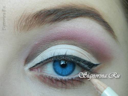11) Чтобы визуально сделать глаз больше, обведём нижнюю слизистую каялом молочного цвета. На фоне макияжа он сразу станет светлее и не подчеркнёт имеющиеся покраснения, как белый карандаш.