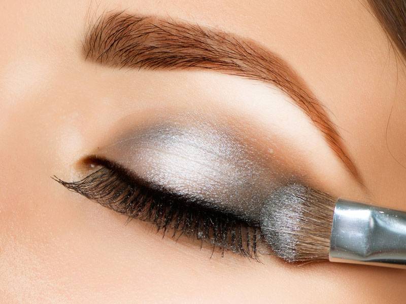 5.Затем на верхние веки кладутся тени близкого к натуральному цвету, а около внешнего угла — тени на тон ярче. Все аккуратно нужно растушевать. Чаще всего накладывают нежно-розовые тени, но оптимально будет подобрать тени под свой цвет глаз и одежду. Очень стильно будут смотреться фиолетовые либо голубые тени. При выборе вечернего образа можно выбрать насыщенные тона.