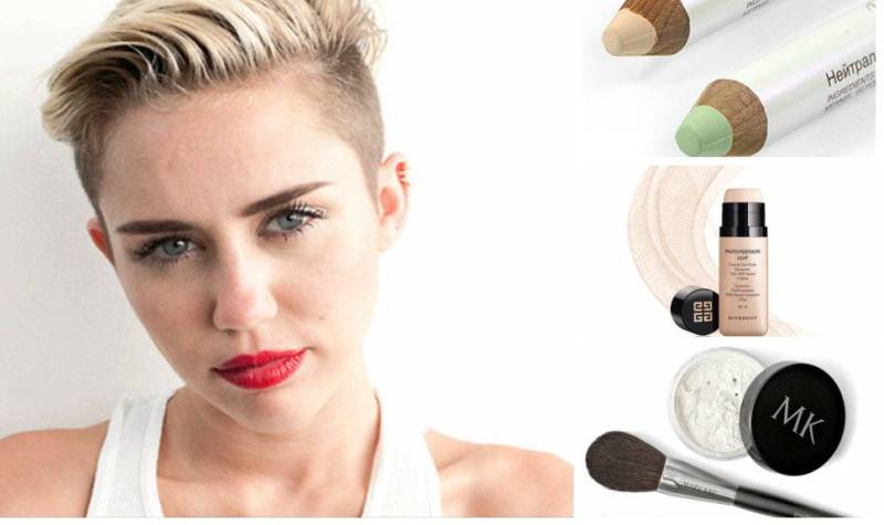 Залогом успешной работы с косметикой является создание эффекта идеальной кожи. Для Майли Сайрус, кроме этого, стоит задача скрыть макияжем округлости своего лица, которыми одарила ее природа. Чтобы достигнуть нужного результата, на лицо наносится основа для косметики, которая хорошо его матирует.