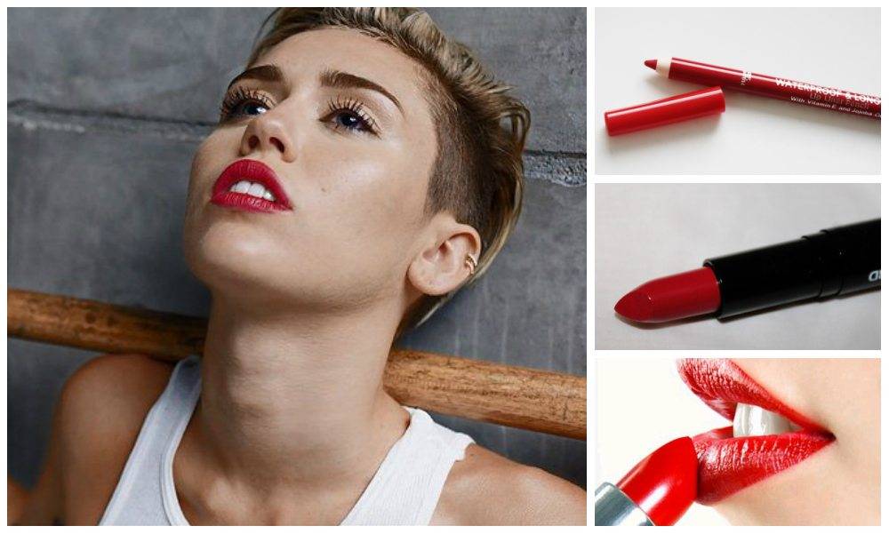 Осталось дело за малым: красные губы- фишка мейк-апа певицы. Разглядывая фото Майли Сайрус, бросается в глаза, что этот оттенок помады явный любимчик певицы и он действительно гармоничен на ее лице и в образе в целом. Поэтапная схема создания алых уст следующая: