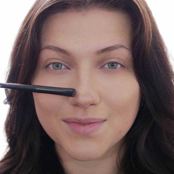 У Меган тонкий нос с острым кончиком. Чтобы выполнить легкую коррекцию, нарисуйте на кончике треугольник скульптором. Также подчеркните скулы.
