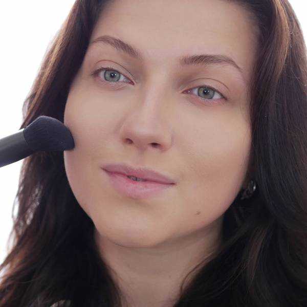 5.При помощи широкой пушистой кисти нанесите бронзер на область скул, также затемните им линию роста волос и область шеи.