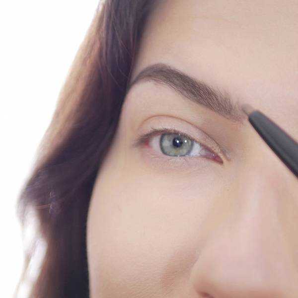 Оформите брови темным карандашом, создавая удлиненное основание и плавный переход к окончанию брови.
