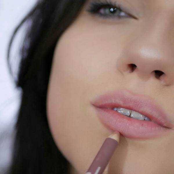 - Приступаем к главному акценту. Губы нужно предварительно подготовить с помощью специальной основы или скраба, а затем нанести бальзам. Дайте бальзаму впитаться или, если вы используете базу, промокните губы салфеткой, а потом слегка припудрите – все это сделает ваш макияж невероятно стойким. Выделите белым карандашом верхний уголок губ для дополнительного объема и четкости контура. Теперь нанесите карандаш по всему контуру и, собственно, помаду.