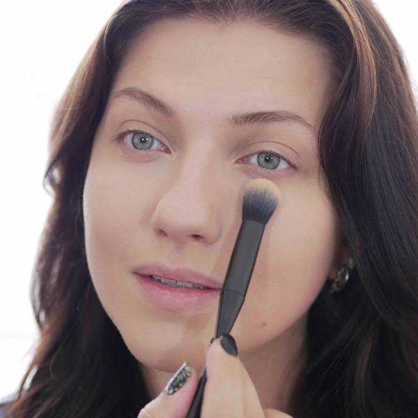 Припудрите консилер светлой пудрой, нанося ее в форме треугольника от внутреннего уголка глаза к крыльям носа и далее ко внешнему уголку, чтобы заодно выполнить скульптурирование.